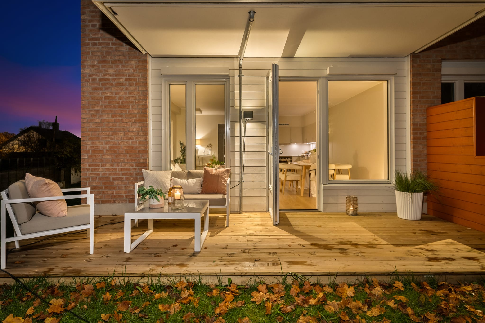 Med tre soverom og to bad, kan man uansett velge. Den private hagen på baksiden er en koselig tumleplass for minsten, og foran er det plass til både urtekasser og solstol. I tillegg til fri bruk av en fantastisk takterrasse en liten heistur opp.