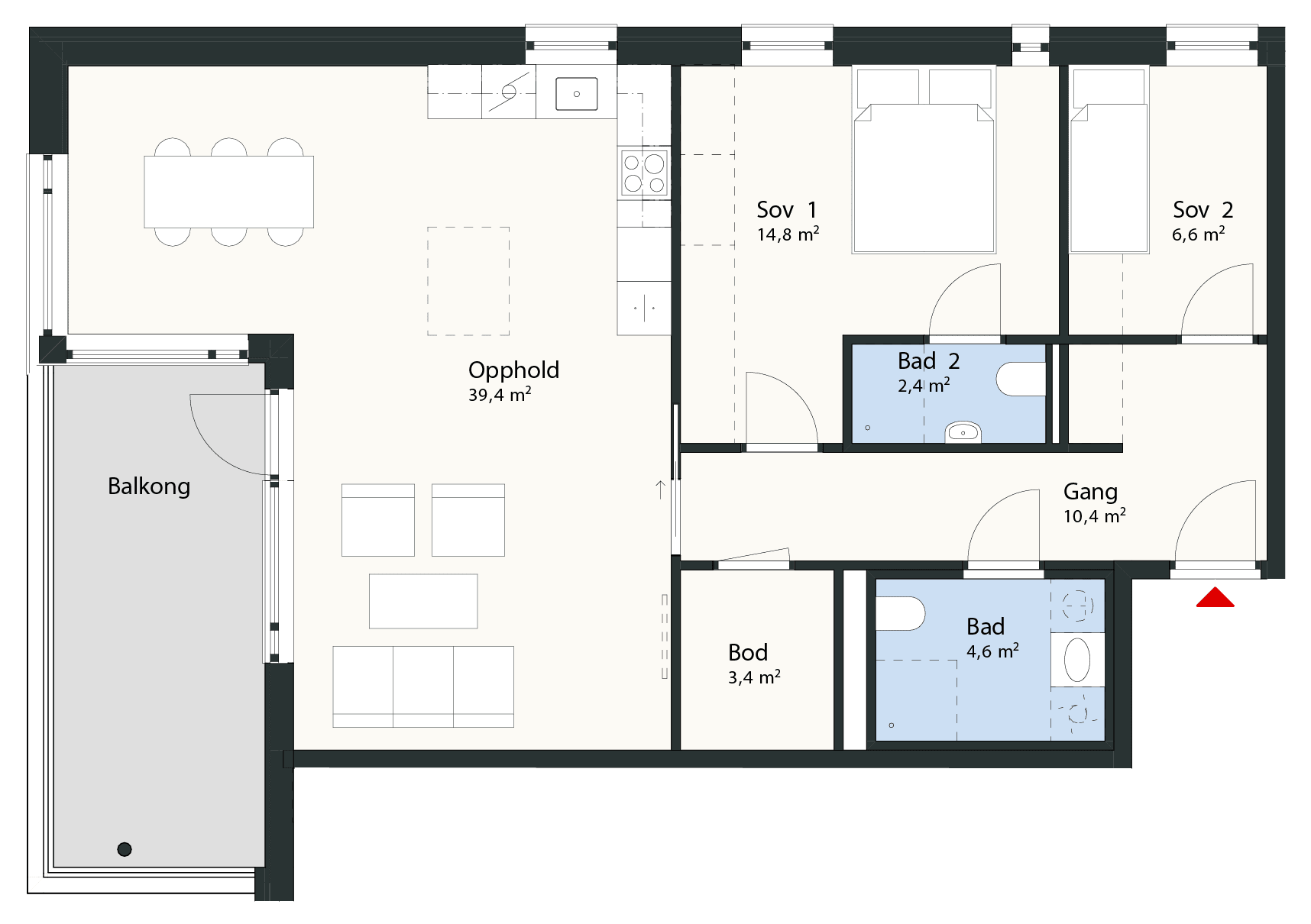 Privat og fin endeleilighet i Smia med en bekvem, privat balkong. God planløsning med stor kombinert stue- og kjøkkenløsning med lys fra tre sider og mulighet for kjøkkenøy. To soverom hvorav ett er direkte tilknyttet bad.