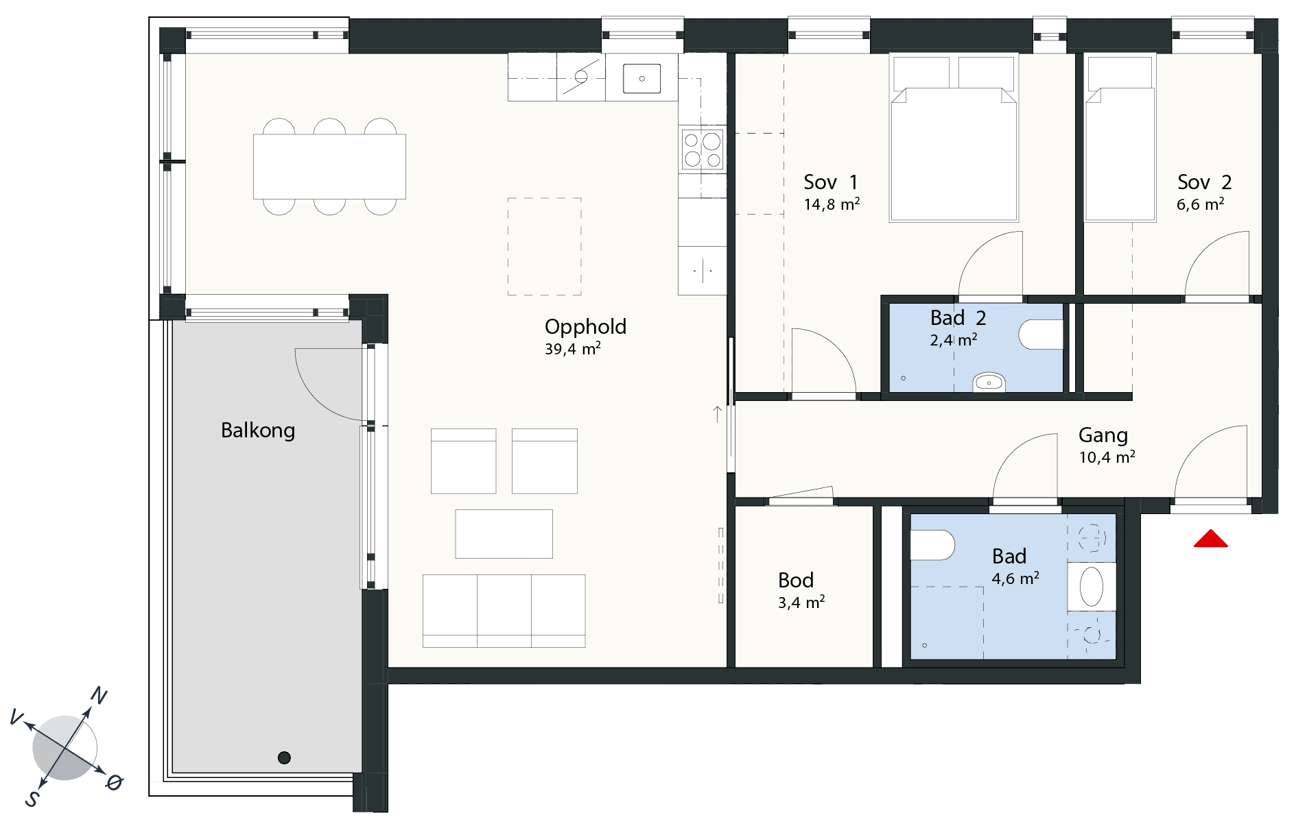 To soverom, hvorav ett med eget bad og gode garderobemuligheter. Kjøkkenet er ekstra flott med lys og lekker hjørneløsning for spisestuen. Store vindusflater binder oppholdsrommet sammen med uteplassen - en vestvendt balkong på 13 kvm.