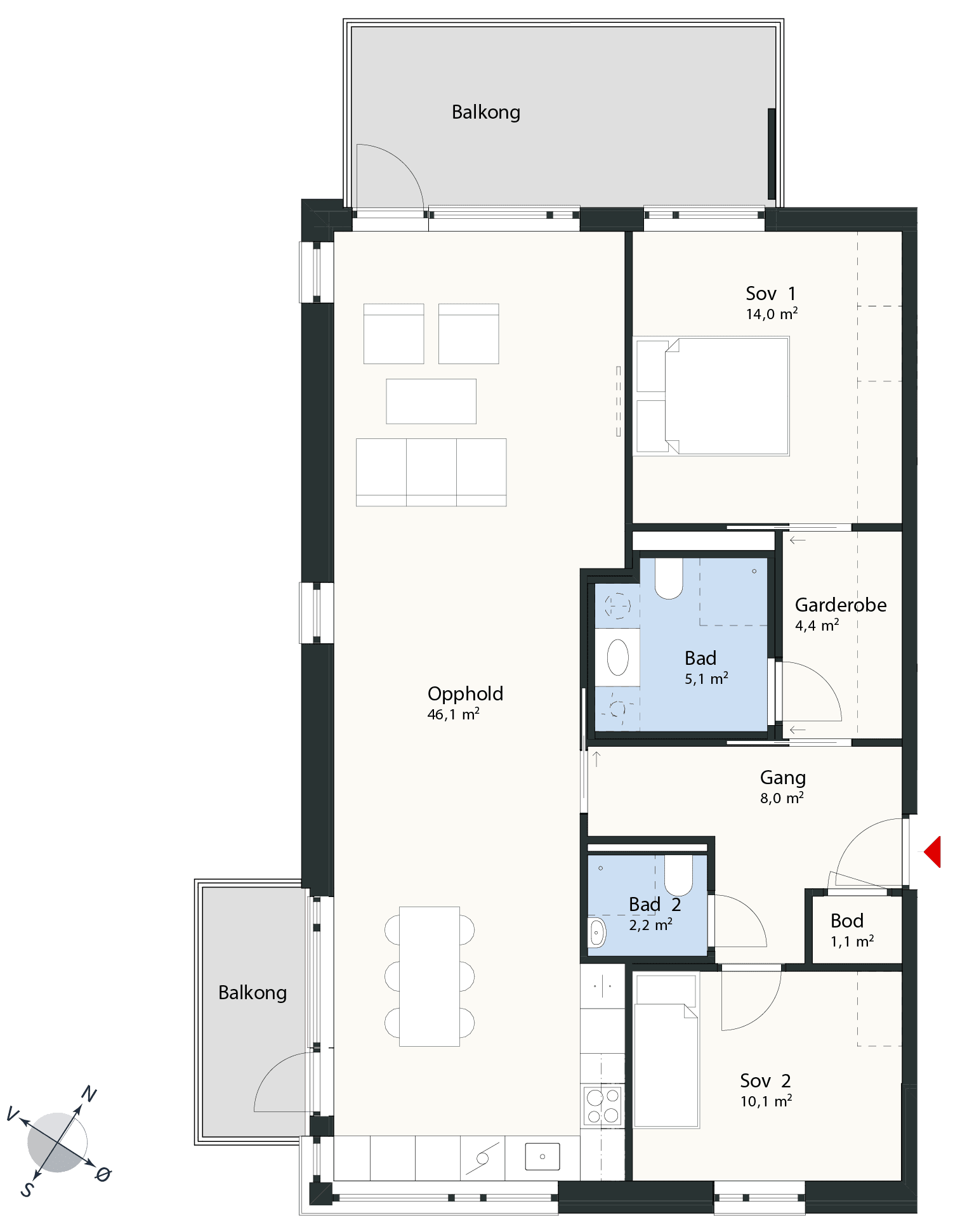 To soverom, hvorav ett med eget bad og garderobe, er både praktisk og en smule luksus. Kjøkkenet er spesielt flott med mye lys, massevis av skapplass og egen balkong. Stuen har også deilige lysflater og direkte adkomst til nok en balkong. En bolig som skapt for gode dager.