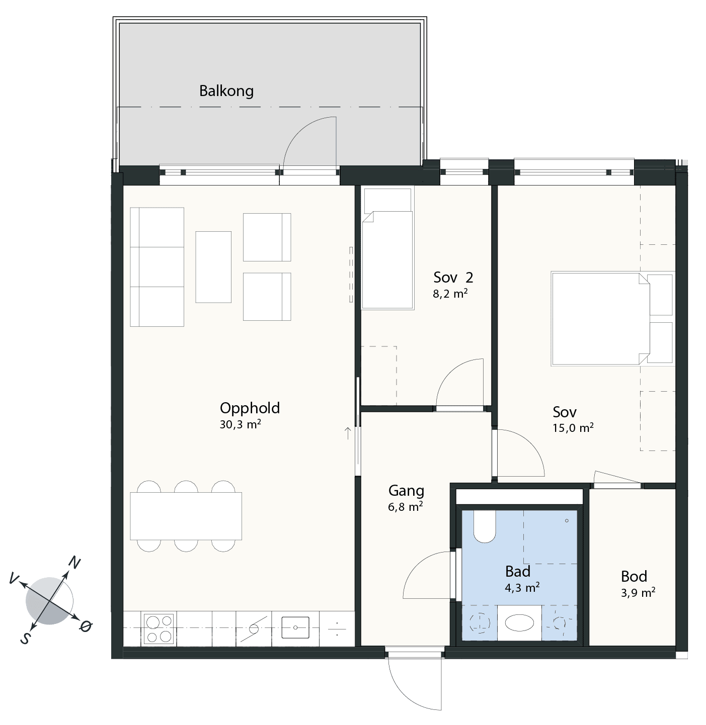 To fine soverom med masse garderobeplass og mulighet for walk-in-closet. Kjøkkenet er plassert langs hele kortveggen og gir plass til ekstra spiseplass eller en kjøkkenøy. Stuen har direkte utgang til en hyggelig balkong.