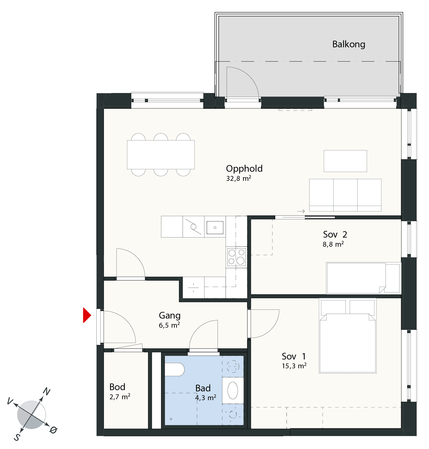 Leiligheten har en genial planløsning med to romslige soverom og gode garderobemuligheter. Kjøkkenet er delvis avdelt fra spiseplassen med en lekker og praktisk halvøy. Store vindusflater på to sider gjør stuen lys og hyggelig. Utgang til hyggelig balkong.