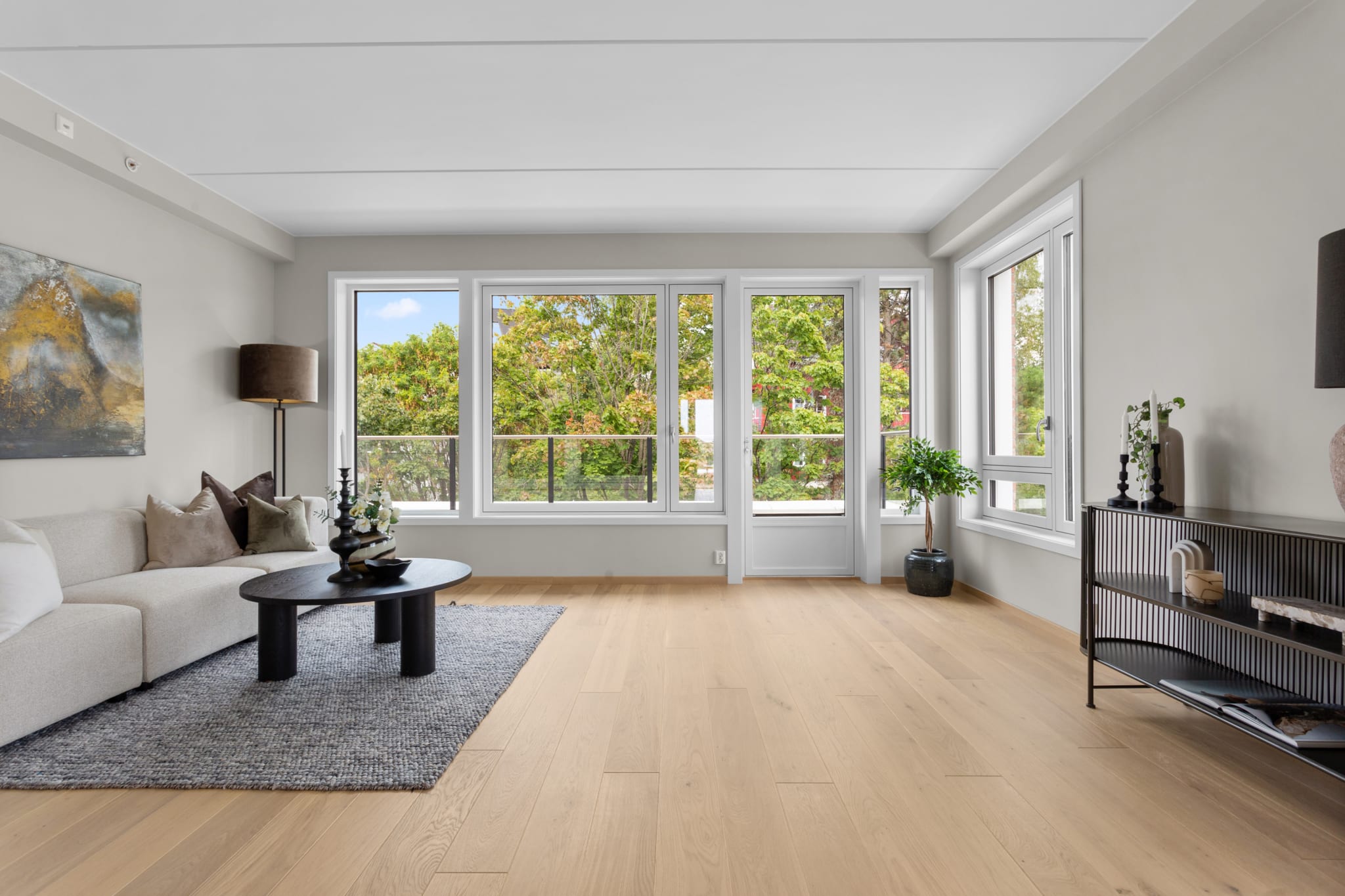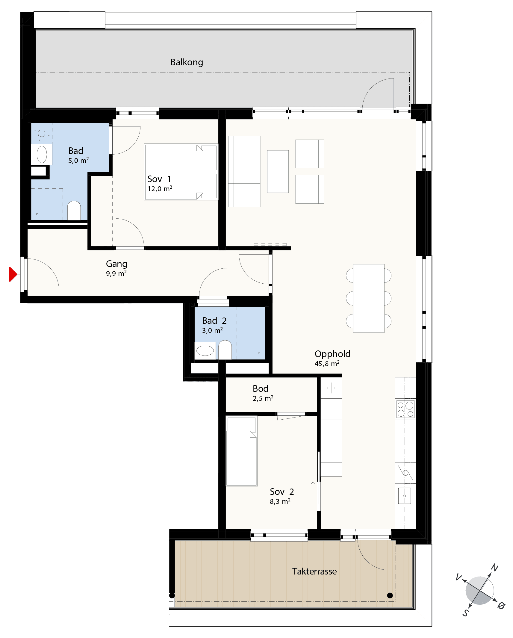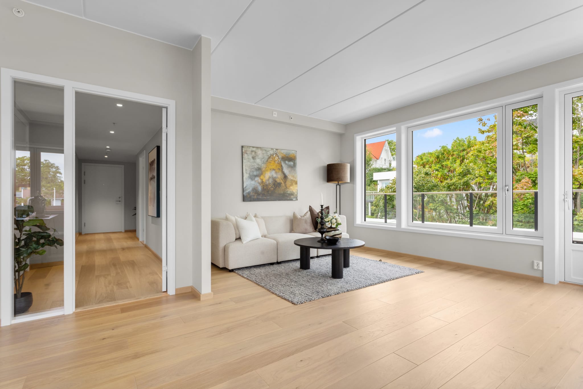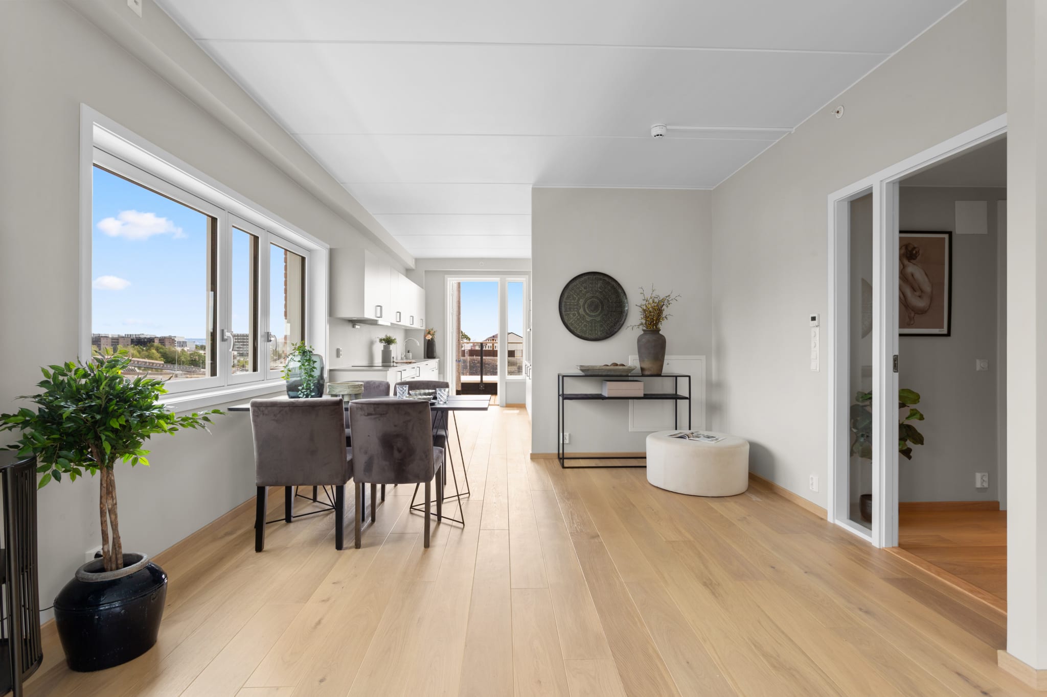 En leiligheten som skapt for gode matopplevelser! Massevis av benk- og skapplass og mulighet for både langbord og lounge på den store balkongen eller takterrassen. To store soverom med tilhørende bad, og en flott gang med garderobemuligheter danner en lekker entré.